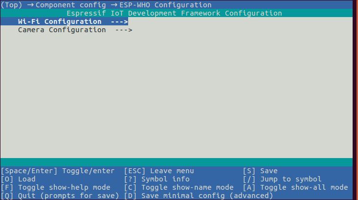 If not using the Espressif development boards mentioned in Hardware, configure the camera pins manually. Enter idf.py menuconfig in the terminal and click (Top) -> Component config -> ESP-WHO Configuration to enter the ESP-WHO configuration interface, as shown below: